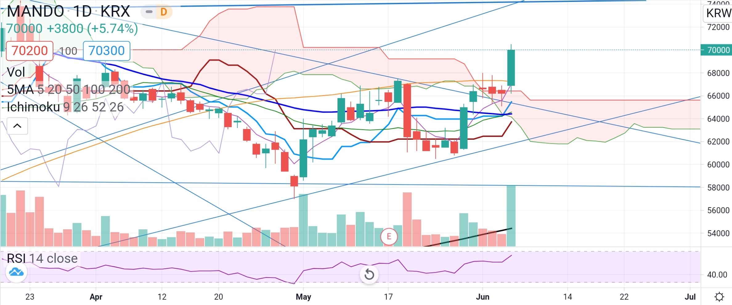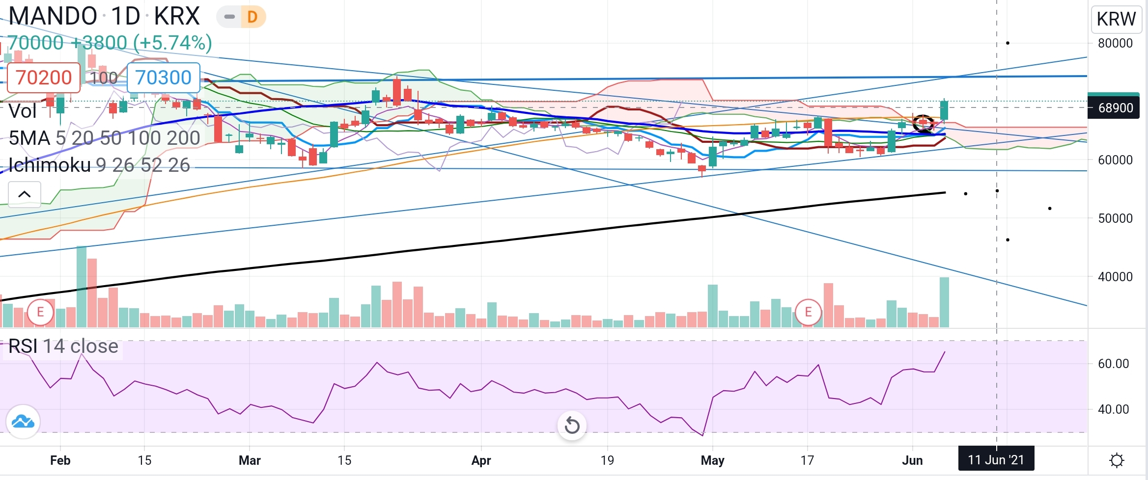 현대차도 차트가 괜찮앗는데 1주당 비싼 주식은 심적거부감이 드는지.. 그냥 만도를 선택하게 됏다