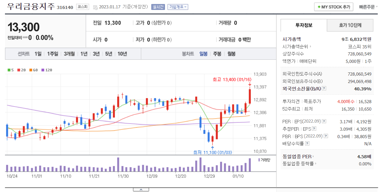 우리금융지주의 어제 종가는 4.31% 상승한 13,300원이었는데요.