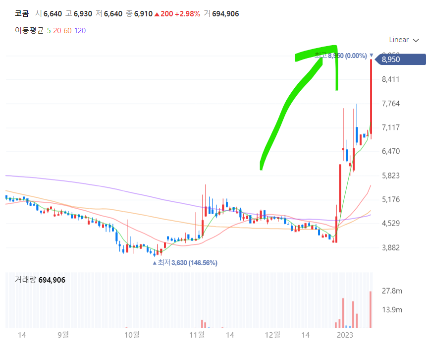 코콤은 22년 12월 말부터 몇차례 큰 폭의 상승을 이루고