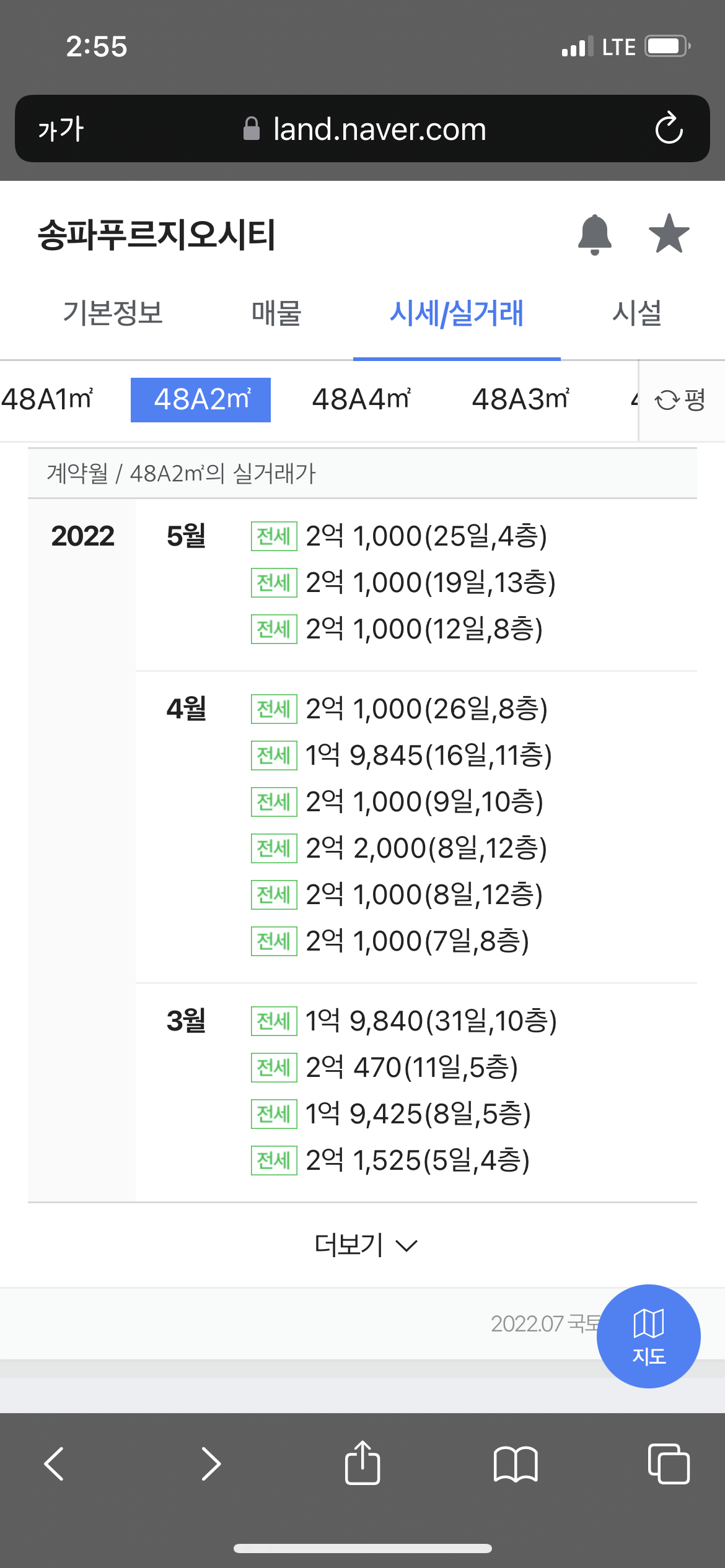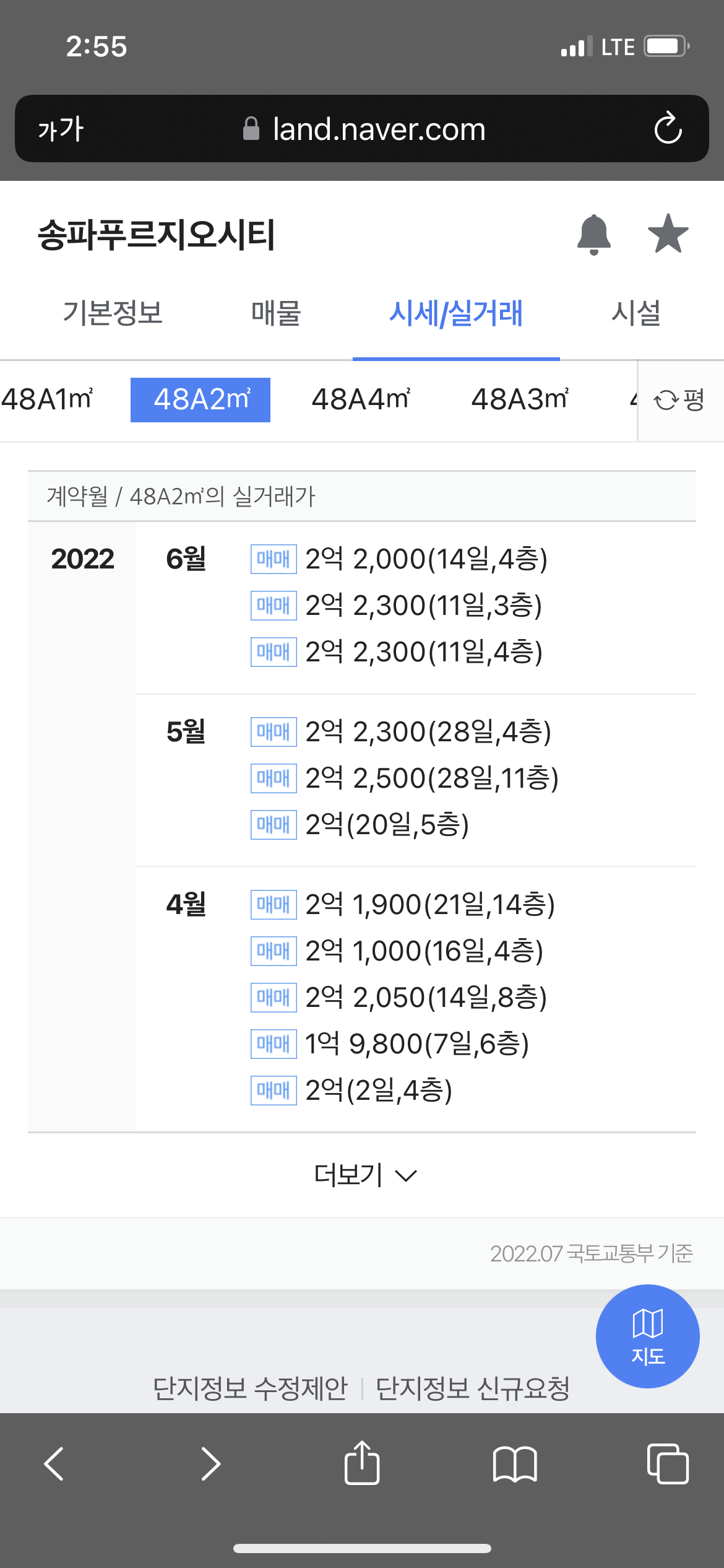 송파푸르지오의 현재 매매 실거래가는 2.2억 정도
