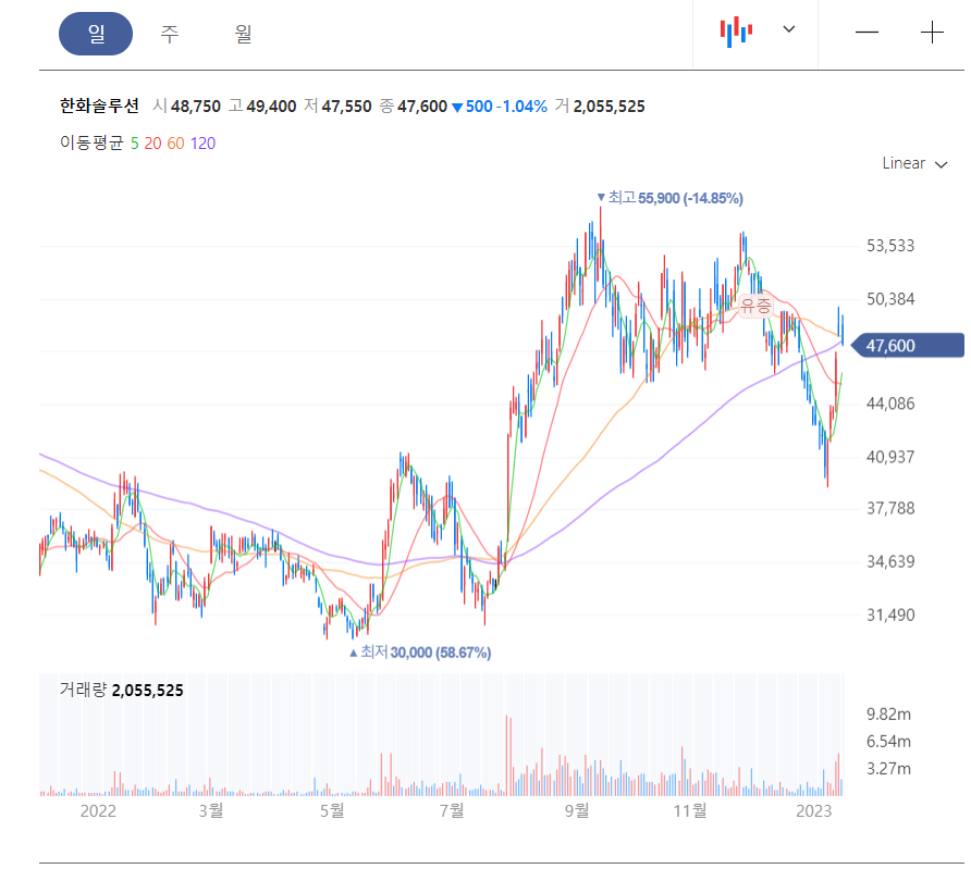 한화솔루션은 작년 9,10월 52주 최고가 55,900원을 찍고 계속 5만원 대 박스권을 유지하다가, 12월 코스피 하락장에 약 37,000원까지 떨어졌습니다.
