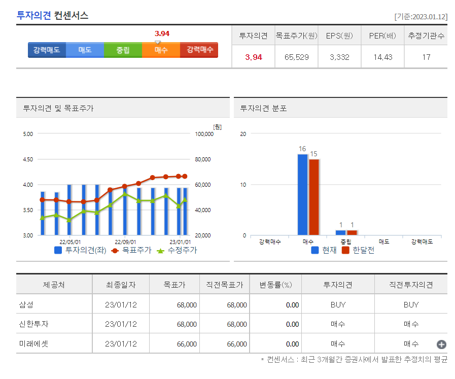 증권사의 투자의견 역시 매수쪽 의견이 강하며, 목표주가는 65,529원 입니다.
