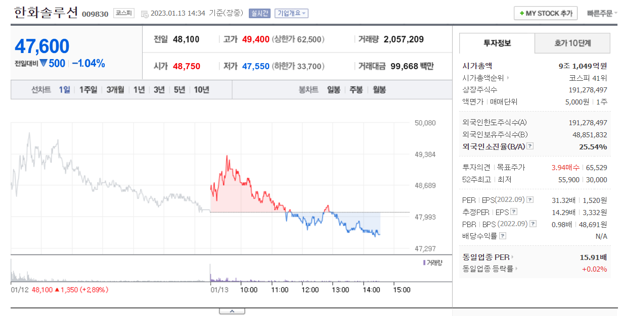 오늘 한화 솔루션 주가는 장 초반 49,400원까지 올라갔다가,