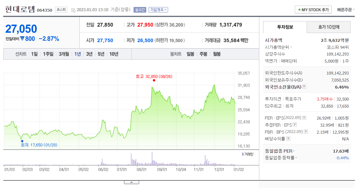 고점을 찍었다가 현재 살짝 떨어지긴 했는데, 과연 2023년에 현대로템 주가가 오를지 더 떨어질지 향방이 궁금해집니다.