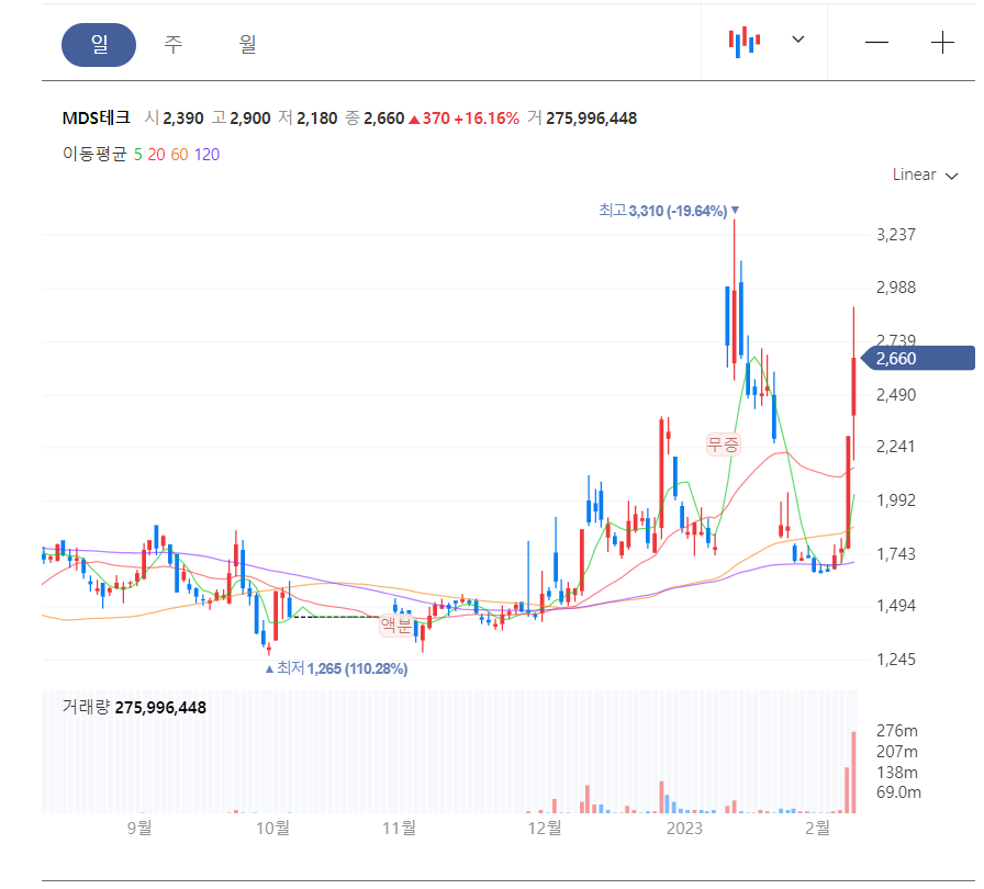 MDS테크의 오늘 주가는 2,660원으로 전일대비 16.16% 상승한 채로 마감을 했는데요.